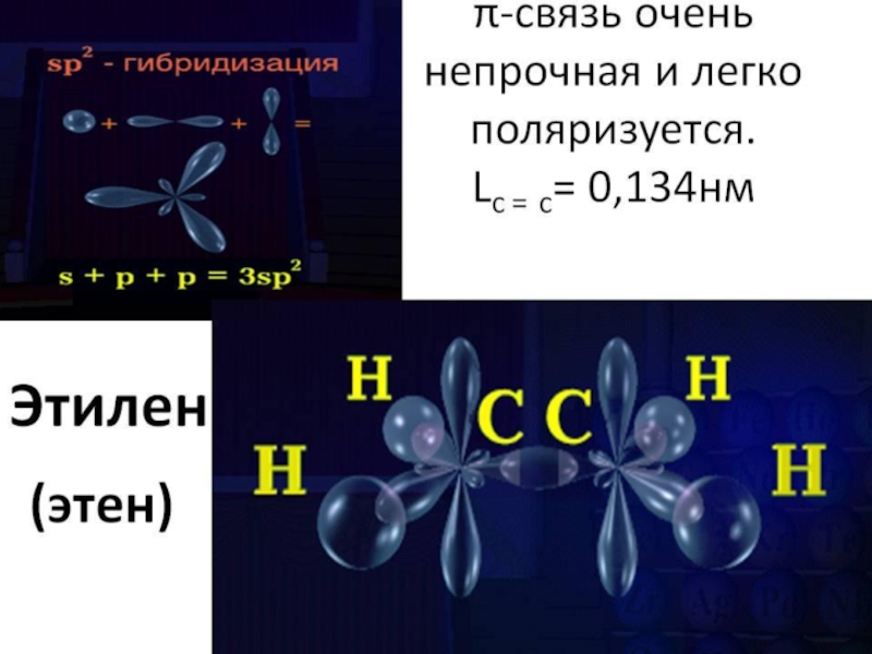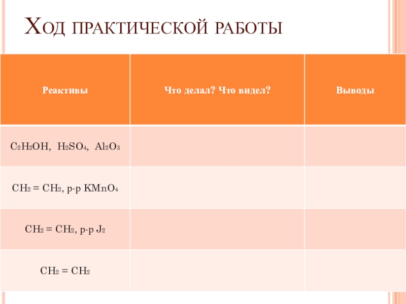 =Реакции присоединенияРеакции окисленияРеакции полимеризацииРеакции замещения+H2 (гидрирование)+ Гаl2 (галогенирование)+HГаl2 (гидрогалогенирование)+H2O (гидратация)Полное (горение)Неполное