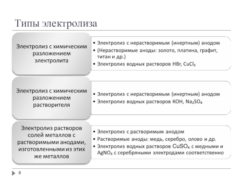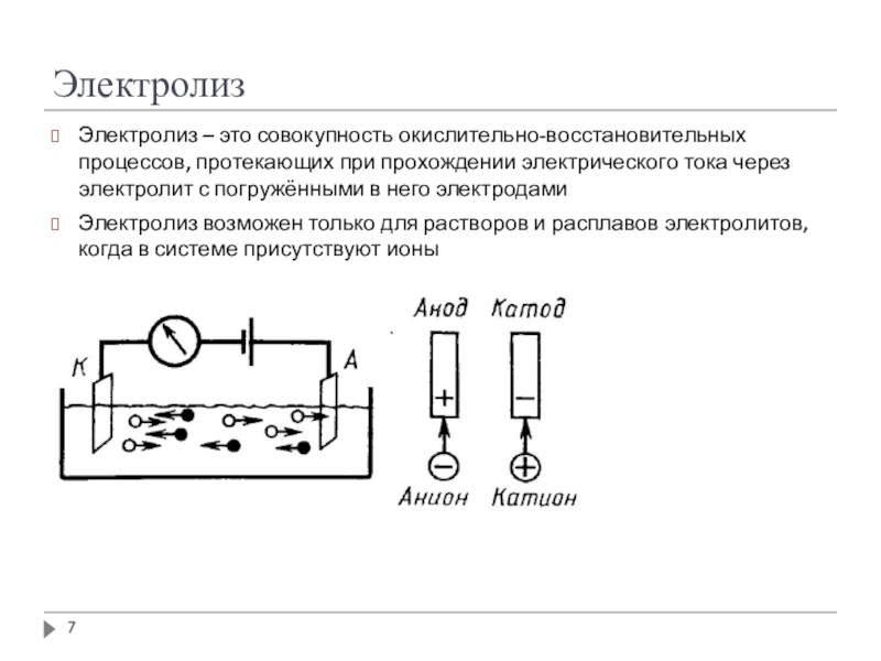 Электролиз Электролиз – это совокупность окислительно-восстановительных процессов, протекающих при прохождении электрического тока через электролит с погружёнными в