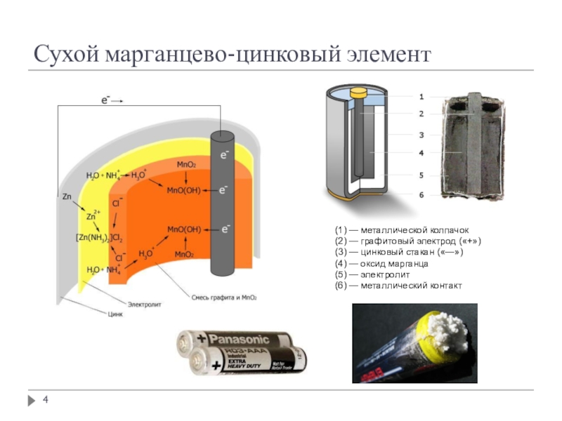 Сухой марганцево-цинковый элемент (1) — металлической колпачок (2) — графитовый электрод («+») (3) — цинковый стакан («—») (4) — оксид марганца