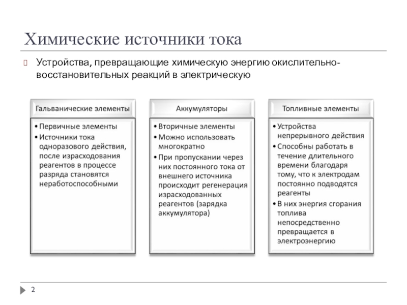 Химические источники токаУстройства, превращающие химическую энергию окислительно-восстановительных реакций в электрическую