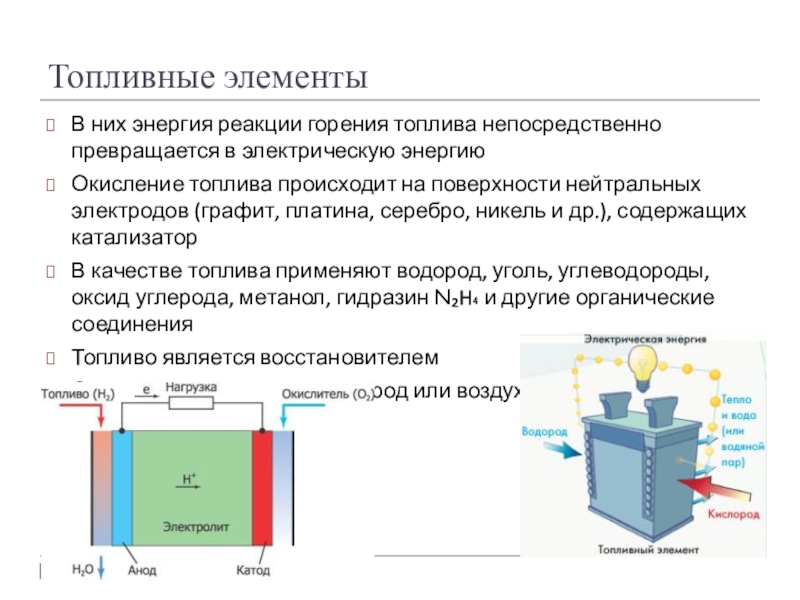 Топливные элементыВ них энергия реакции горения топлива непосредственно превращается в электрическую энергию Окисление топлива происходит на поверхности