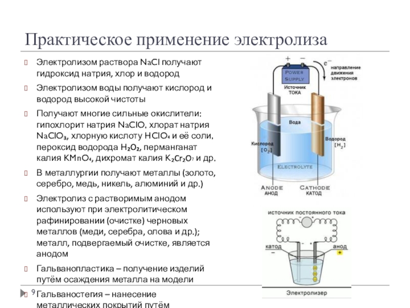Практическое применение электролизаЭлектролизом раствора NaCl получают гидроксид натрия, хлор и водородЭлектролизом воды получают кислород и водород высокой