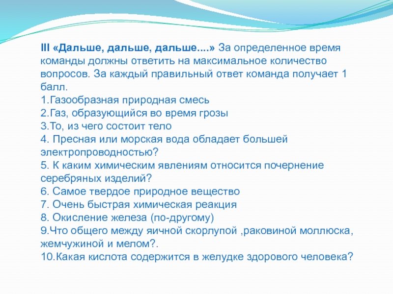 Слайд 5III «Дальше, дальше, дальше....» За определенное время команды должны ответить на