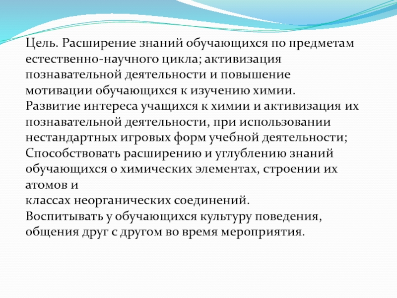 Цель. Расширение знаний обучающихся по предметам естественно-научного цикла; активизация