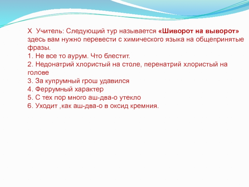 Слайд 9Χ Учитель: Следующий тур называется «Шиворот на выворот» здесь вам нужно