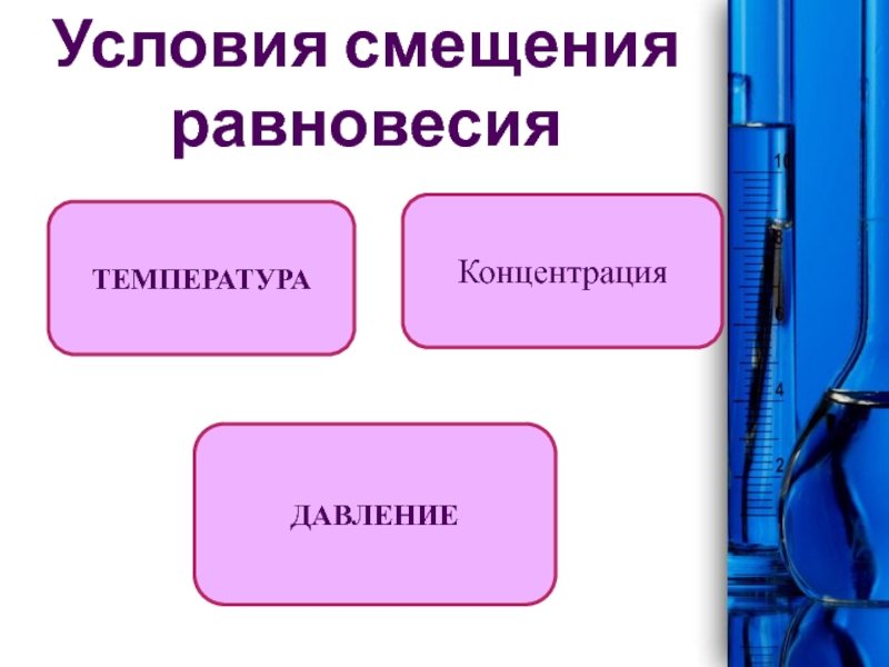 Условия смещения равновесияТЕМПЕРАТУРАКонцентрацияДАВЛЕНИЕ