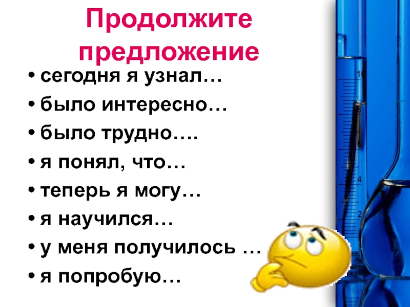 Продолжите предложениесегодня я узнал…было интересно…было трудно….я понял, что…теперь я могу…я научился…у меня получилось …я попробую…