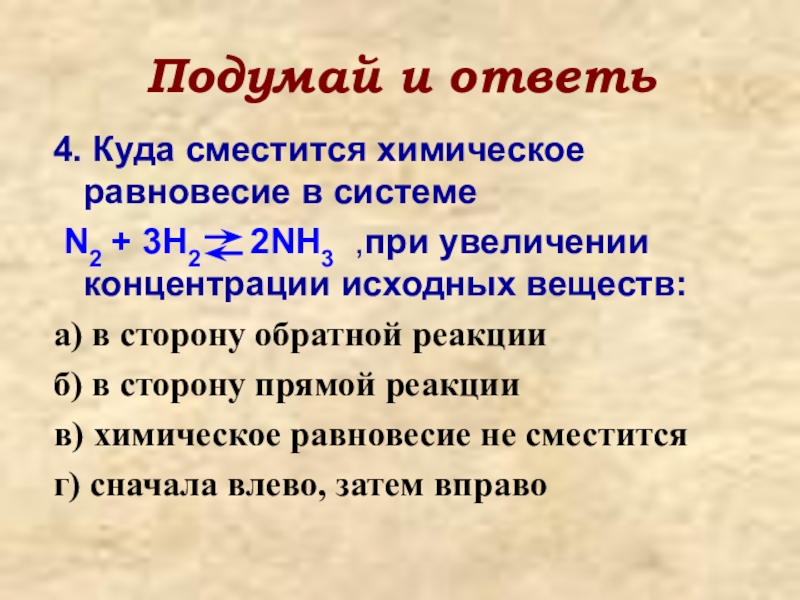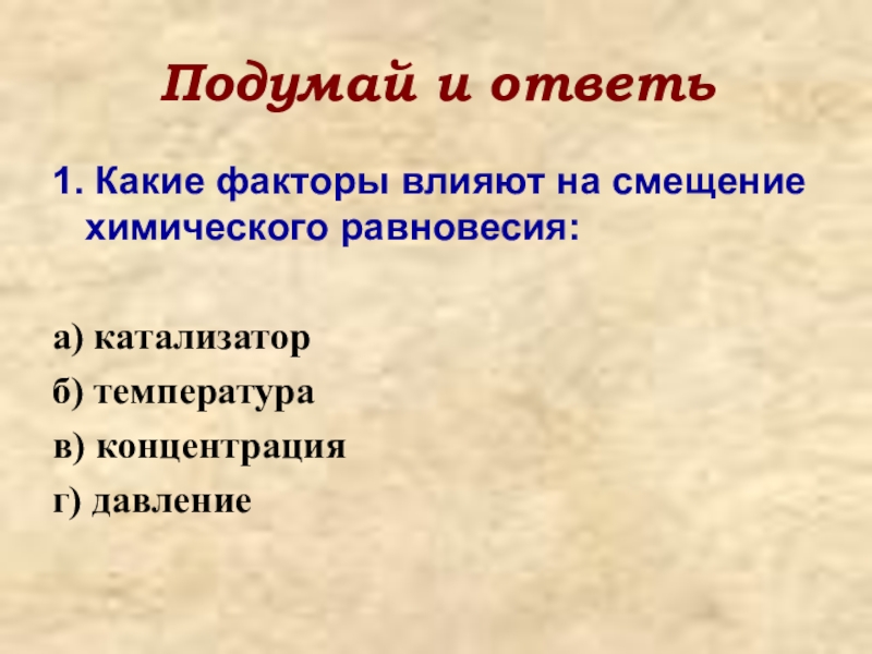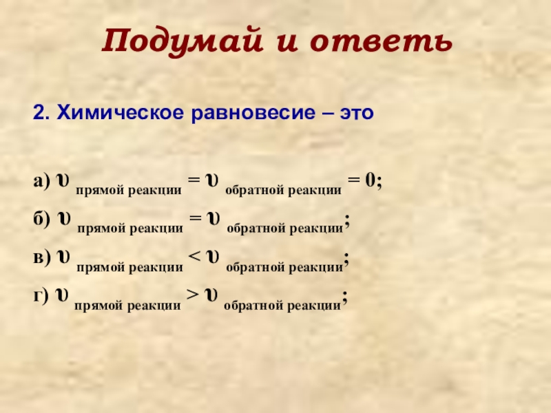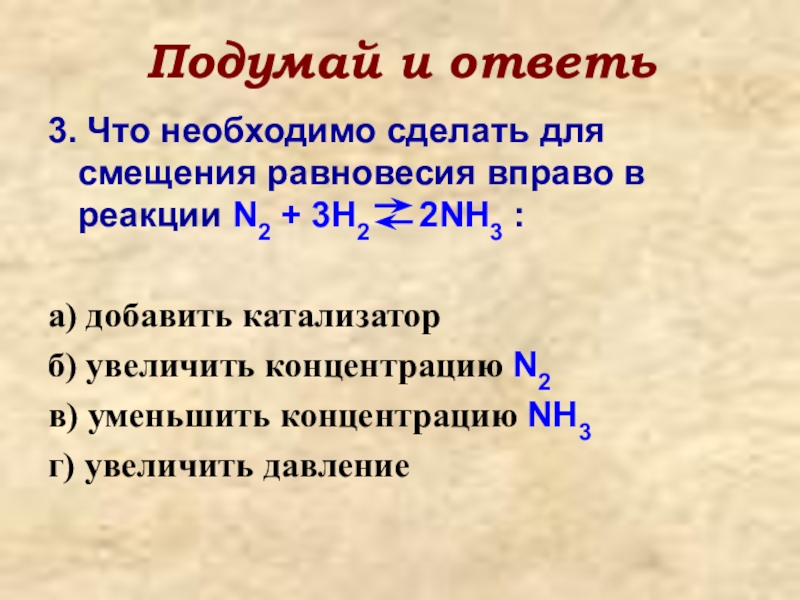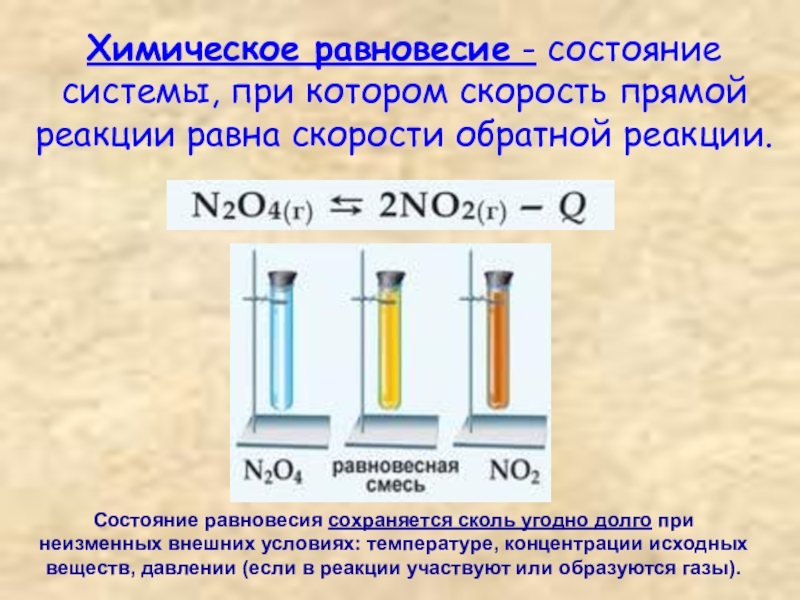 Состояние равновесия сохраняется сколь угодно долго при неизменных внешних условиях: температуре, концентрации исходных веществ, давлении (если в реакции участвуют или образуются газы).