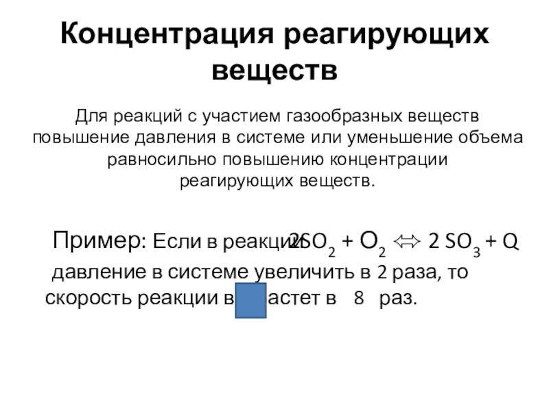 давление в системе увеличить в 2 раза, то скорость реакции возрастет в 8 раз.
