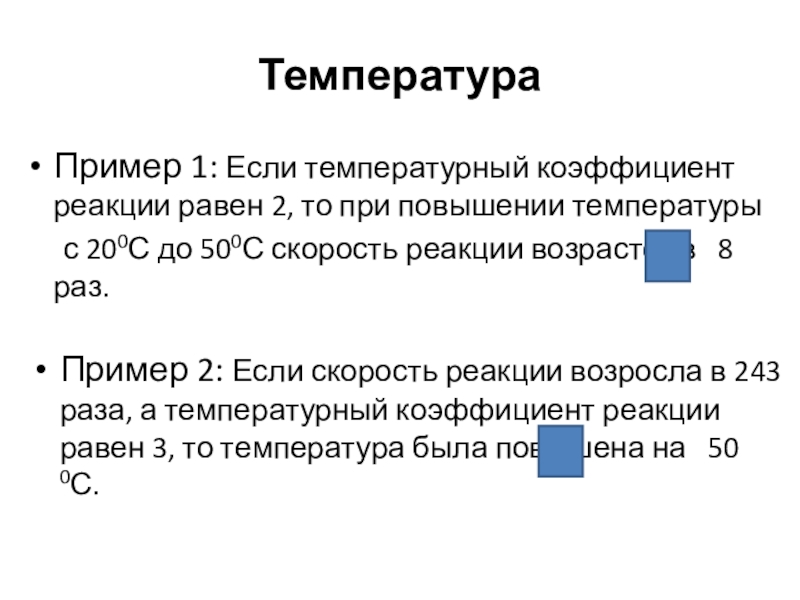 Пример 2: Если скорость реакции возросла в 243 раза, а температурный коэффициент реакции равен 3, то температура была повышена на 50 0С.