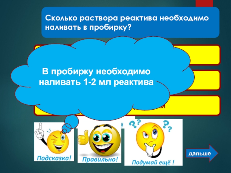 Слайд 46Сколько раствора реактива необходимо наливать в пробирку?
