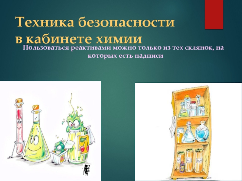 В кабинете химии запрещается принимать пищу и напитки. Запрещается пробовать реактивы на вкус.