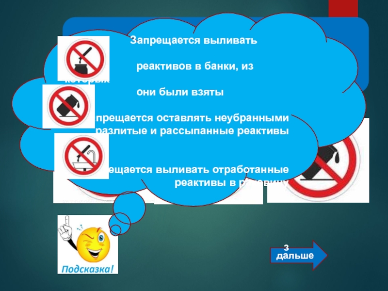 Слайд 43Какой знак запрещает оставлять неубранными разлитые или рассыпанные реактивы?