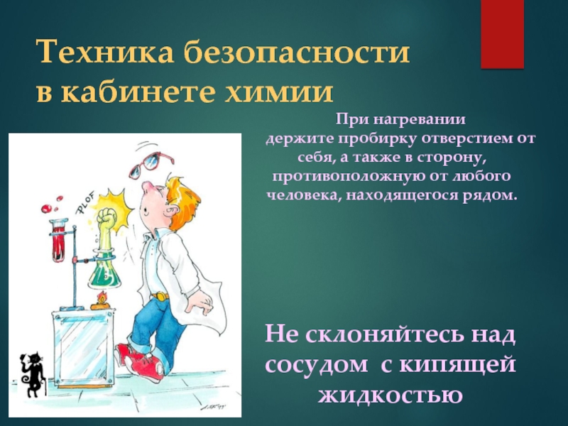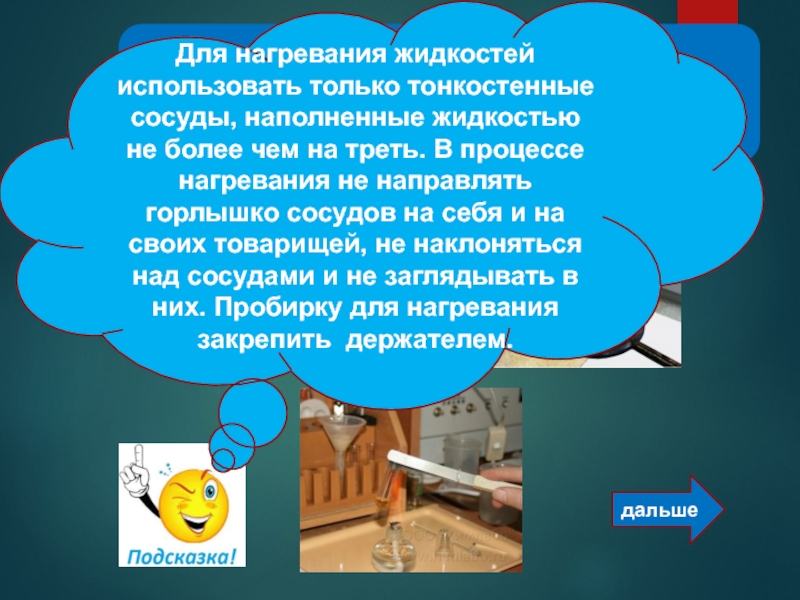 сосуды, наполненные жидкостью не более чем на треть. В процессе нагревания не направлять горлышко сосудов на себя и на своих товарищей, не наклоняться над сосудами и не заглядывать в них. Пробирку для нагревания закрепить держателем.