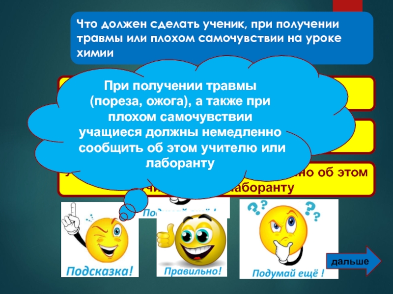 Слайд 48Что должен сделать ученик, при получении травмы или плохом самочувствии на
