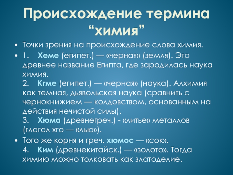 4. Ким (древнекитайск.) — «золото». Тогда химию можно толковать как златоделие.