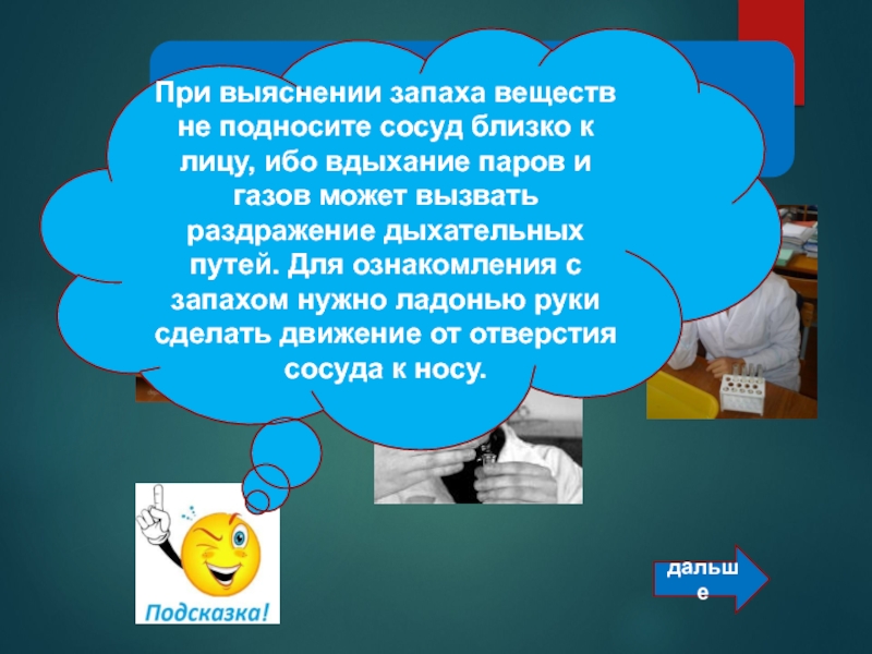 Слайд 45На каком рисунке показано, как правильно определять запах веществ?