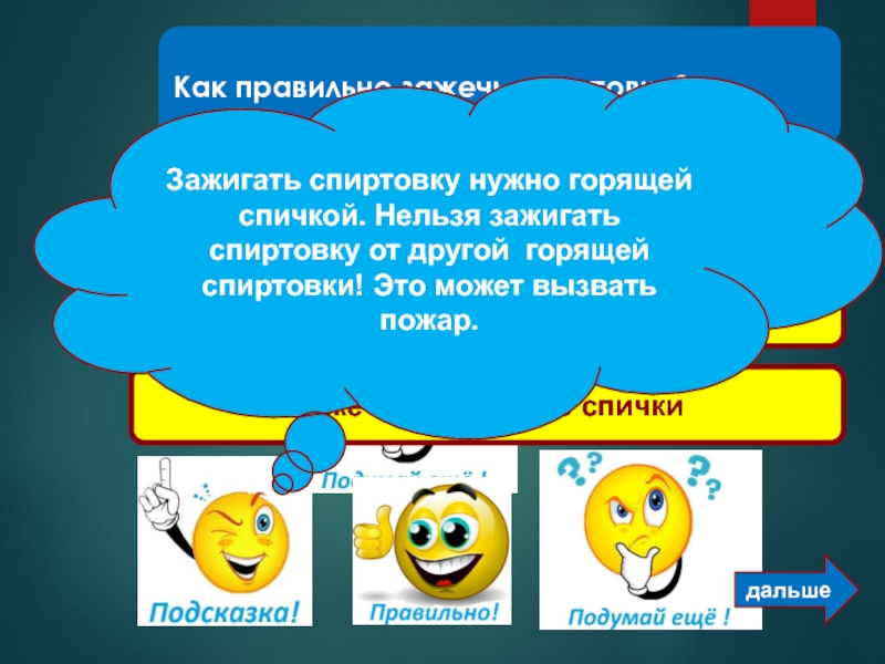 Зажигать спиртовку нужно горящей спичкой. Нельзя зажигать спиртовку от другой горящей спиртовки! Это может вызвать пожар.