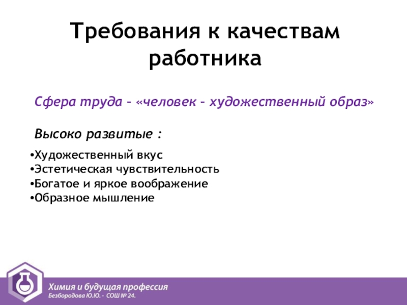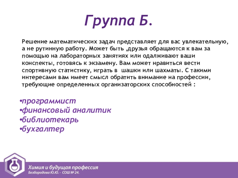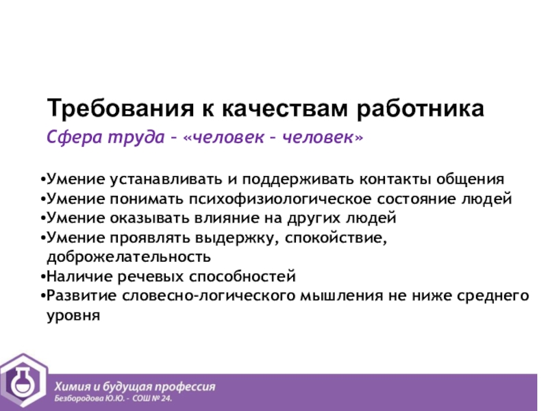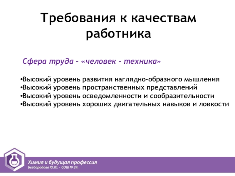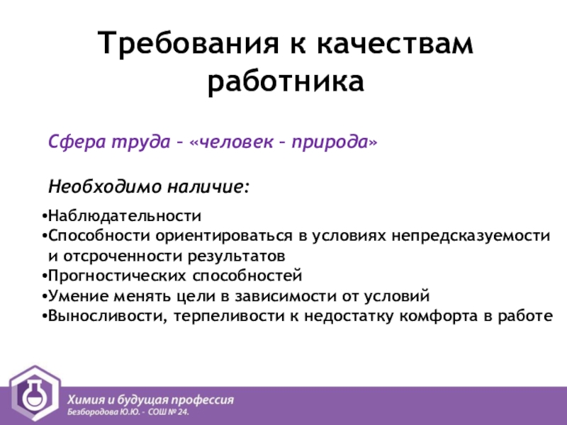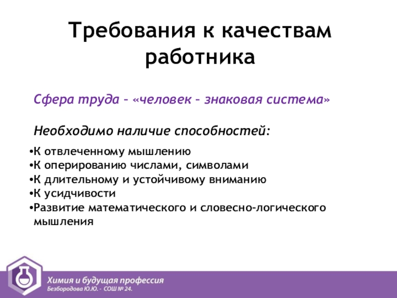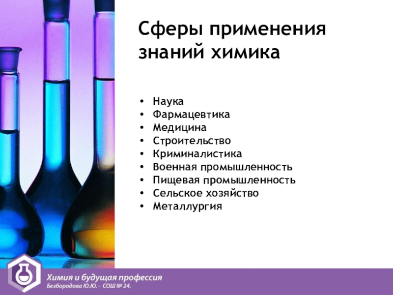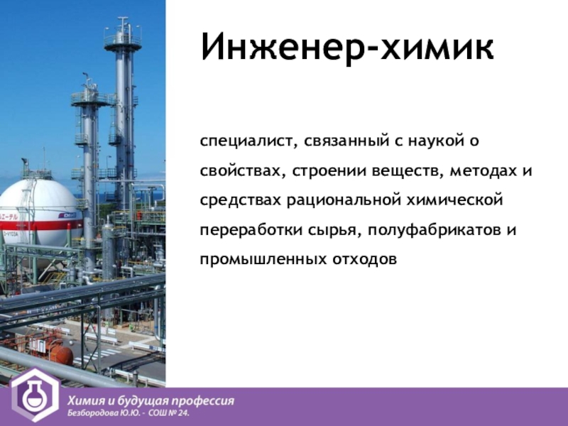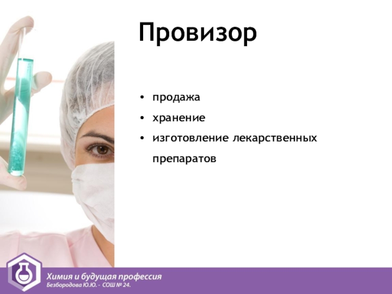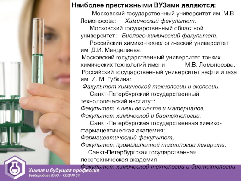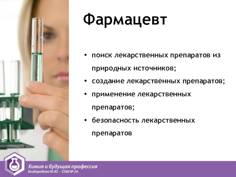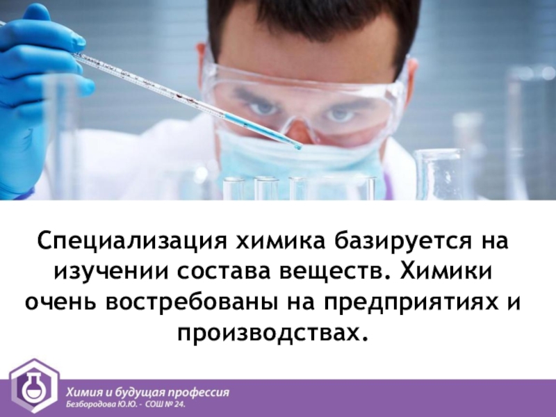 Слайд 30Специализация химика базируется на изучении состава веществ. Химики очень востребованы на