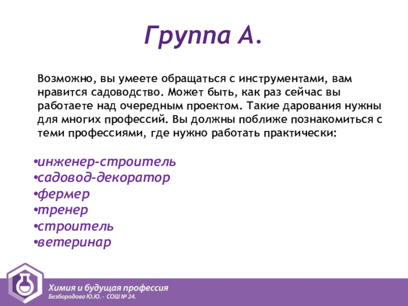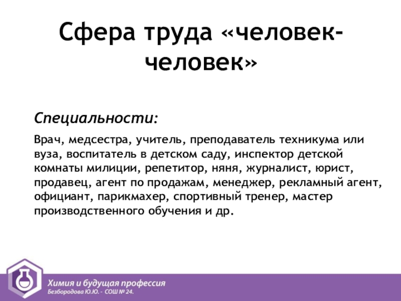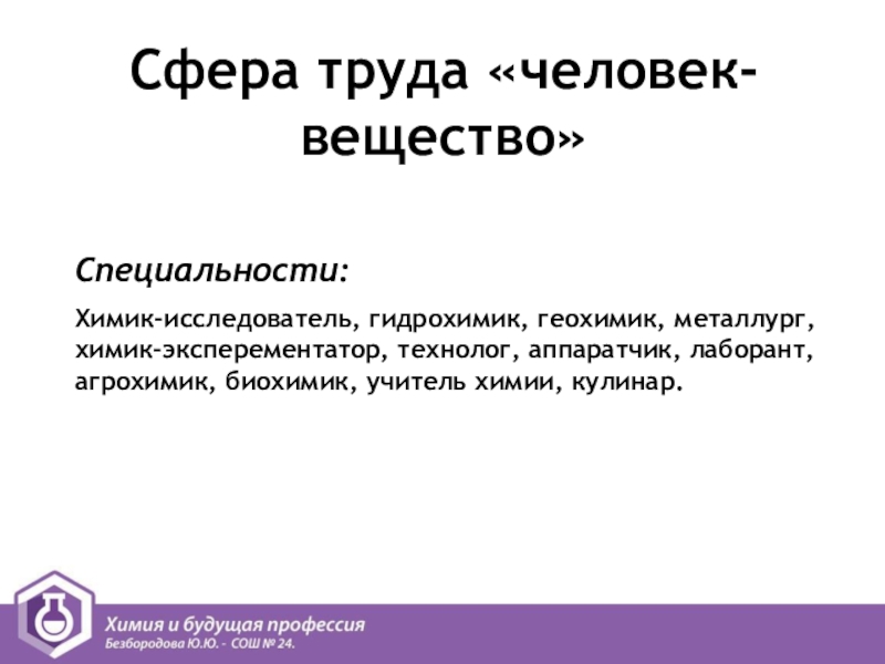 Химик-исследователь, гидрохимик, геохимик, металлург, химик-эксперементатор, технолог, аппаратчик, лаборант, агрохимик,
