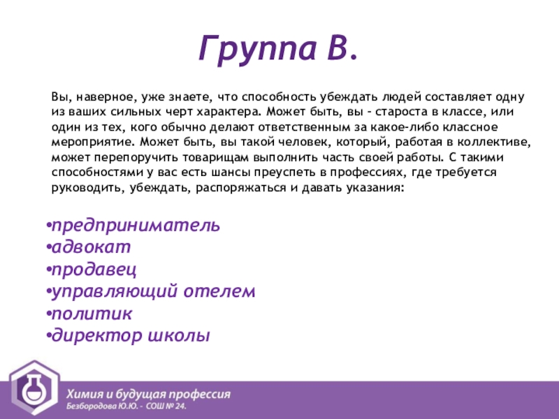 ваших сильных черт характера. Может быть, вы - староста в классе, или один из тех, кого обычно делают ответственным за какое-либо классное мероприятие. Может быть, вы такой человек, который, работая в коллективе, может перепоручить товарищам выполнить часть своей работы. С такими способностями у вас есть шансы преуспеть в профессиях, где требуется руководить, убеждать, распоряжаться и давать указания: