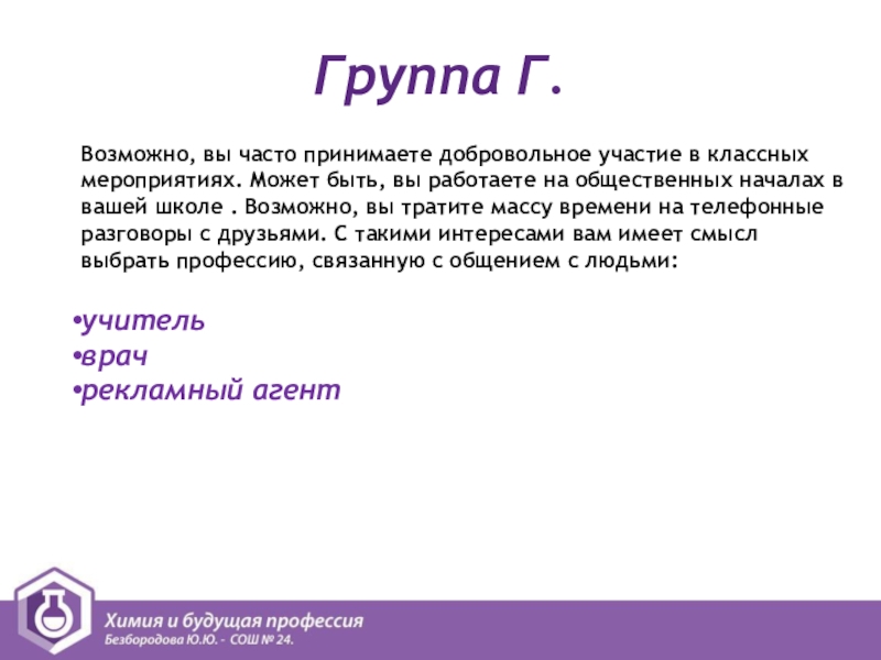 вы работаете на общественных началах в вашей школе . Возможно, вы тратите массу времени на телефонные разговоры с друзьями. С такими интересами вам имеет смысл выбрать профессию, связанную с общением с людьми: