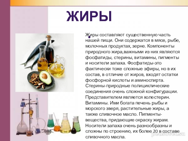 молочных продуктах, зерне. Компоненты природного жира,важными из них являются фосфатиды, стерины, витамины, пигменты и носители запаха. Фосфатиды-это фактически тоже сложные эфиры, но в их состав, в отличие от жиров, входят остатки фосфорной кислоты и аминоспирта. Стерины-природные полициклические соединения очень сложной конфигурации. Представителем является холестерин. Витамины. Ими богата печень рыбы и морского зверя, растительные жиры, а также сливочное масло. Пигменты-вещества, придающие окраску жирам. Носители запаха очень разнообразны и сложны по строению, их более 20 в составе сливочного масла.