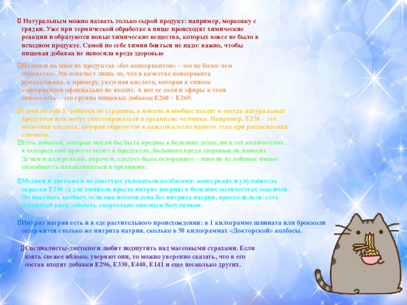 Сами по себе Е-добавки не страшны, а многие и вообще входят в состав натуральных продуктов или могут синтезироваться в организме человека. Например, Е270 – это молочная кислота, которая образуется в каждой клетке нашего тела при расщеплении глюкозы.