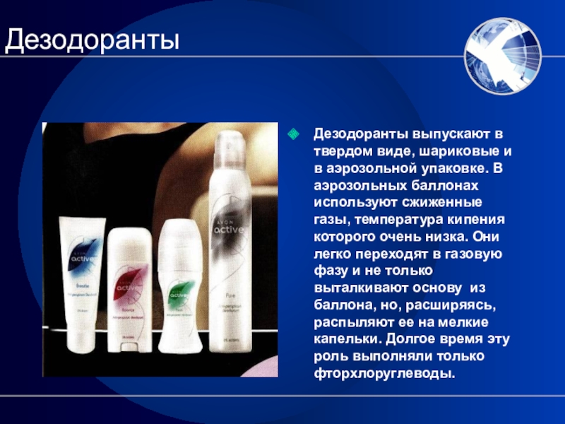 ДезодорантыДезодоранты выпускают в твердом виде, шариковые и в аэрозольной упаковке. В аэрозольных баллонах используют сжиженные газы, температура
