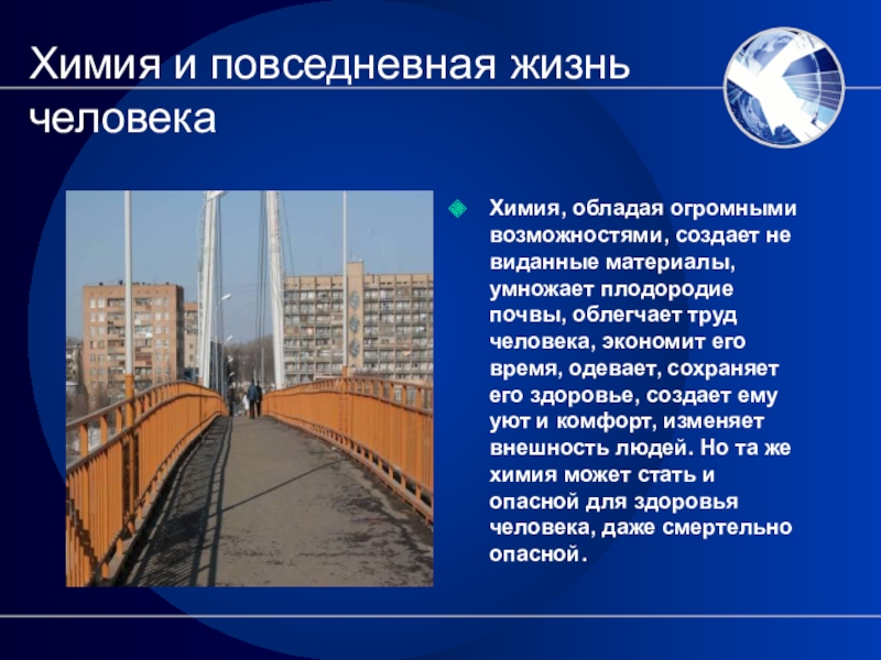 Химия и повседневная жизнь человекаХимия, обладая огромными возможностями, создает не виданные материалы, умножает плодородие почвы, облегчает труд