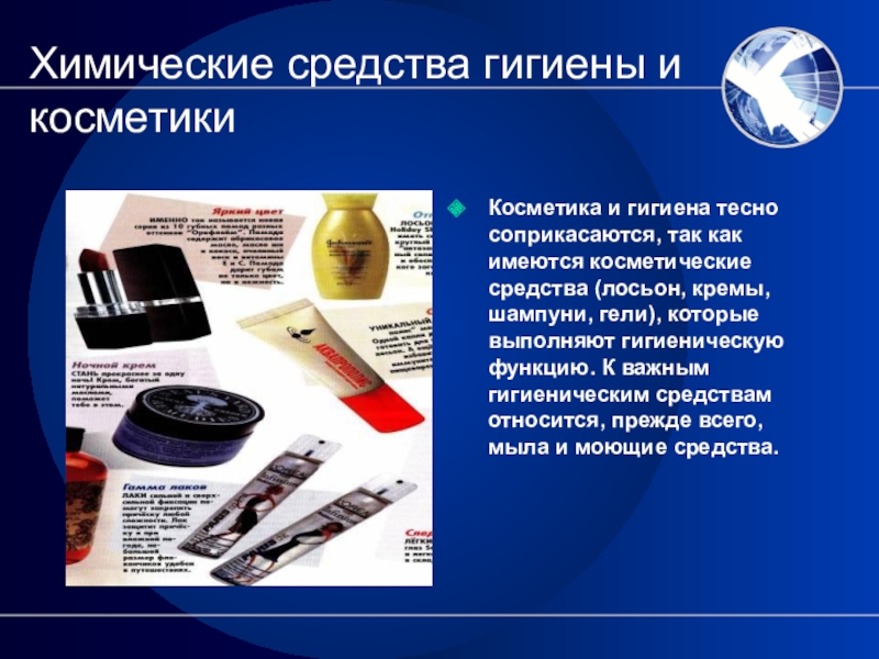 Химические средства гигиены и косметикиКосметика и гигиена тесно соприкасаются, так как имеются косметические средства (лосьон, кремы, шампуни,