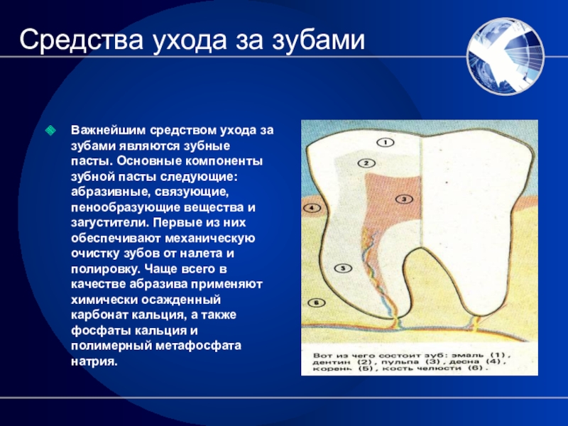 Средства ухода за зубамиВажнейшим средством ухода за зубами являются зубные пасты. Основные компоненты зубной пасты следующие: абразивные,