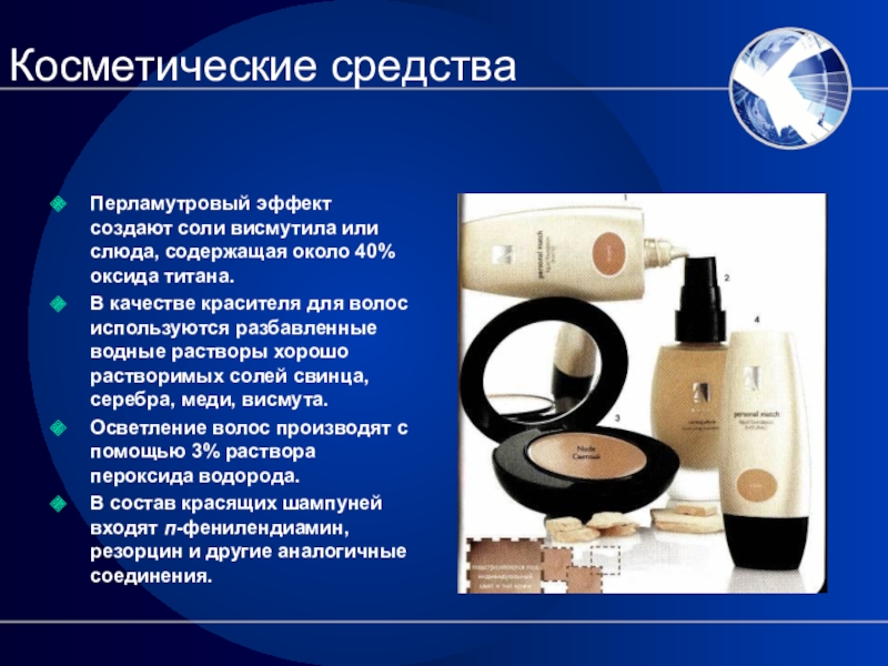 Косметические средстваПерламутровый эффект создают соли висмутила или слюда, содержащая около 40% оксида титана.В качестве красителя для волос