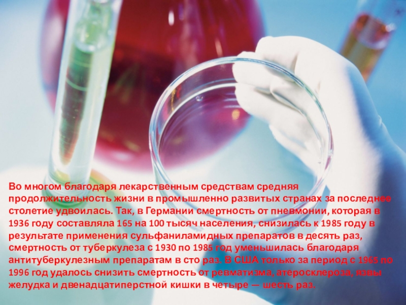 странах за последнее столетие удвоилась. Так, в Германии смертность от пневмонии, которая в 1936 году составляла 165 на 100 тысяч населения, снизилась к 1985 году в результате применения сульфаниламидных препаратов в десять раз, смертность от туберкулеза с 1930 по 1985 год уменьшилась благодаря антитуберкулезным препаратам в сто раз. В США только за период с 1965 по 1996 год удалось снизить смертность от ревматизма, атеросклероза, язвы желудка и двенадцатиперстной кишки в четыре — шесть раз.