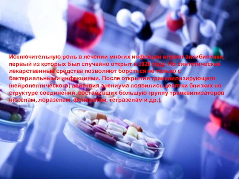 был случайно открыт в 1928 году. Но синтетические лекарственные средства позволяют бороться не только с бактериальными инфекциями. После открытия транквилизирующего (нейролептического) действия элениума появились десятки близких по структуре соединений, составивших большую группу транквилизаторов (нозепам, лоразепам, феназепам, тетразепам и др.).