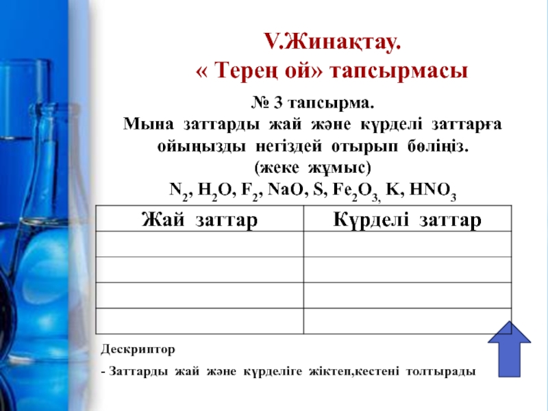- Заттарды жай және күрделіге жіктеп,кестені толтырады
