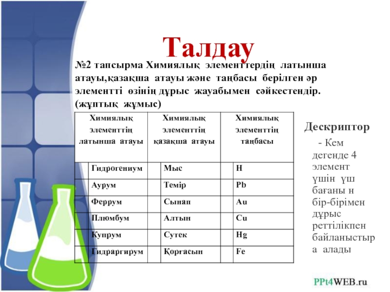 - Кем дегенде 4 элемент үшін үш бағаны н бір-бірімен дұрыс реттілікпен байланыстыра алады