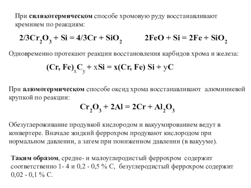 Для получения феррохрома с пониженным содержанием углерода (средне-, мало- и безуглеродистый феррохром) применяют силикотермический и алюмотермический способы, а также продувку кислородом жидкого углеродистого феррохрома с последующим вакуумированием.