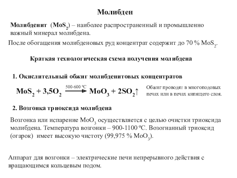 Возгонка или испарение MoO3 осуществляется с целью очистки триоксида молибдена. Температура возгонки – 900-1100 ºС. Возогнанный триоксид (огарок) имеет высокую чистоту (99,975 % MоО3).