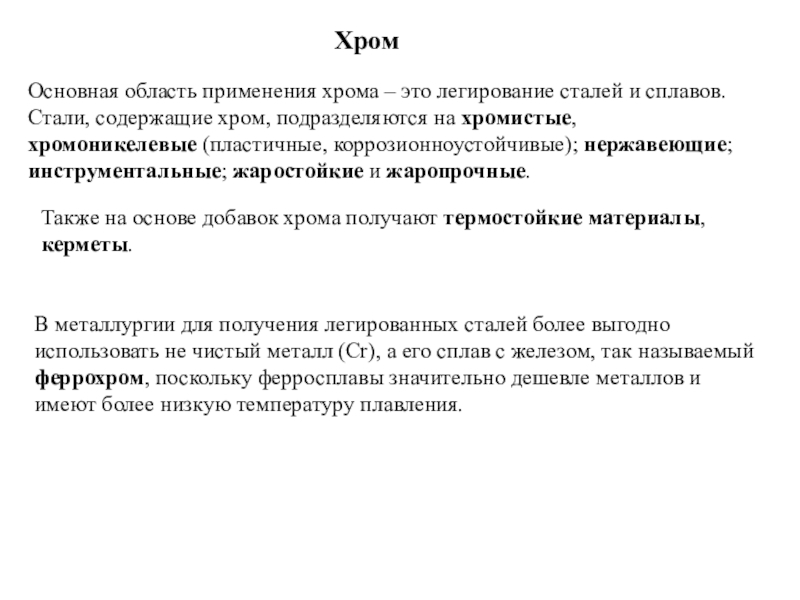Основная область применения хрома – это легирование сталей и сплавов. Стали, содержащие хром, подразделяются на хромистые, хромоникелевые (пластичные, коррозионноустойчивые); нержавеющие; инструментальные; жаростойкие и жаропрочные.