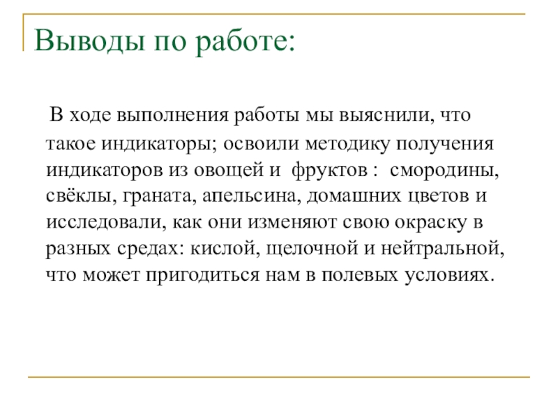такое индикаторы; освоили методику получения индикаторов из овощей и фруктов : смородины, свёклы, граната, апельсина, домашних цветов и исследовали, как они изменяют свою окраску в разных средах: кислой, щелочной и нейтральной, что может пригодиться нам в полевых условиях.