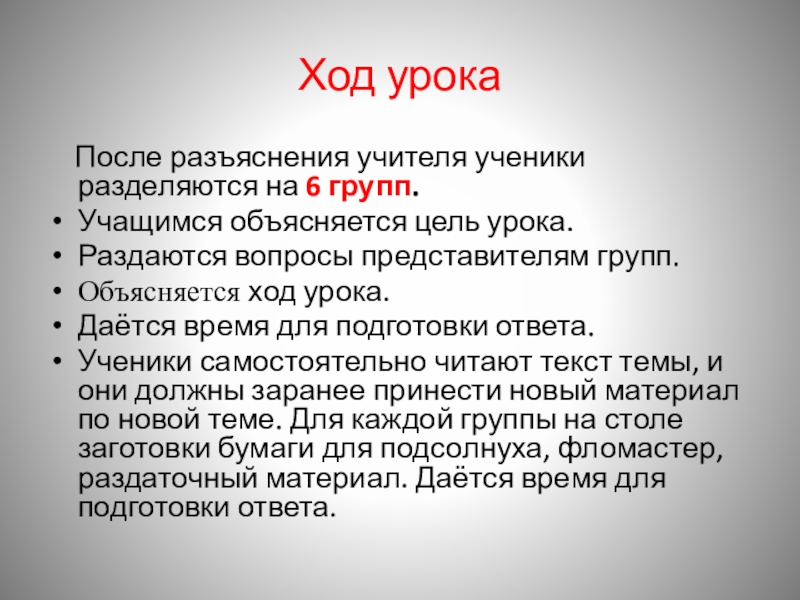 Ученики самостоятельно читают текст темы, и они должны заранее принести новый материал по новой теме. Для каждой группы на столе заготовки бумаги для подсолнуха, фломастер, раздаточный материал. Даётся время для подготовки ответа.
