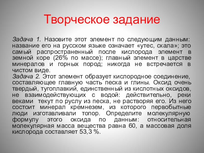 Задача 2. Этот элемент образует кислородное соединение, составляющее главную часть песка и глины. Оксид очень твердый, тугоплавкий, единственный из кислотных оксидов, не взаимодействующих с водой: действительно, реки веками текут по руслу из песка, не растворяя его. Из него состоит минерал кремнезем, из которого первобытные люди изготавливали топор. Определите молекулярную формулу этого оксида по данным: относительная молекулярная масса вещества равна 60, а массовая доля кислорода составляет 53,3 %.