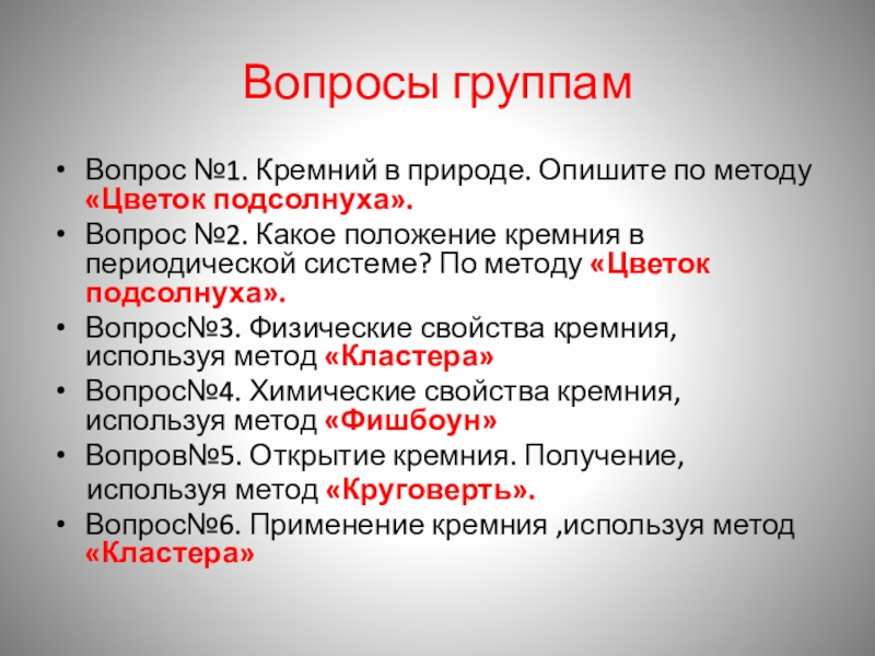 Вопрос №1. Кремний в природе. Опишите по методу «Цветок подсолнуха».