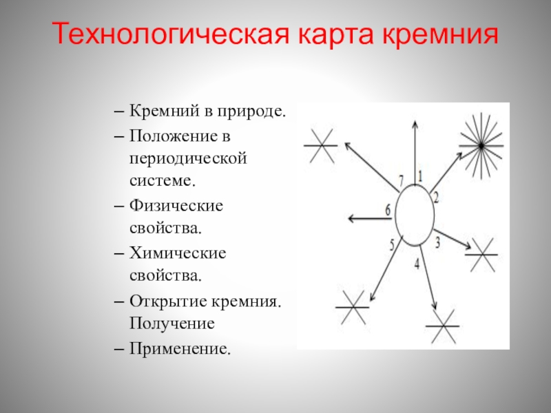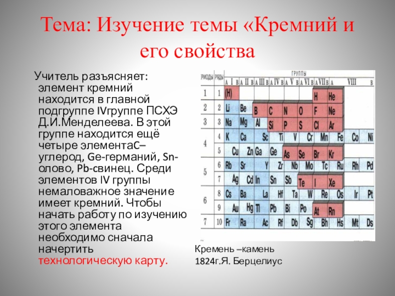 кремний находится в главной подгруппе IVгруппе ПСХЭ Д.И.Менделеева. В этой группе находится ещё четыре элементаC–углерод, Gе-германий, Sn-олово, Pb-cвинец. Среди элементов IV группы немаловажное значение имеет кремний. Чтобы начать работу по изучению этого элемента необходимо сначала начертить технологическую карту.