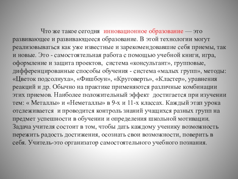 такое сегодня инновационное образование — это развивающее и развивающееся образование. В этой технологии могут реализовываться как уже известные и зарекомендовавшие себя приемы, так и новые. Это - самостоятельная работа с помощью учебной книги, игра, оформление и защита проектов, система «консультант», групповые, дифференцированные способы обучения - система «малых групп», методы: «Цветок подсолнуха», «Фишбоун», «Круговерть», «Кластер», уравнения реакций и др. Обычно на практике применяются различные комбинации этих приемов. Наиболее положительный эффект достигается при изучении тем: « Металлы» и «Неметаллы» в 9-х и 11-х классах. Каждый этап урока отслеживается и проводится контроль знаний учащихся разных групп на предмет успешности в обучении и определения школьной мотивации. Задача учителя состоит в том, чтобы дать каждому ученику возможность пережить радость достижения, осознать свои возможности, поверить в себя. Учитель-это организатор самостоятельного учебного познания.