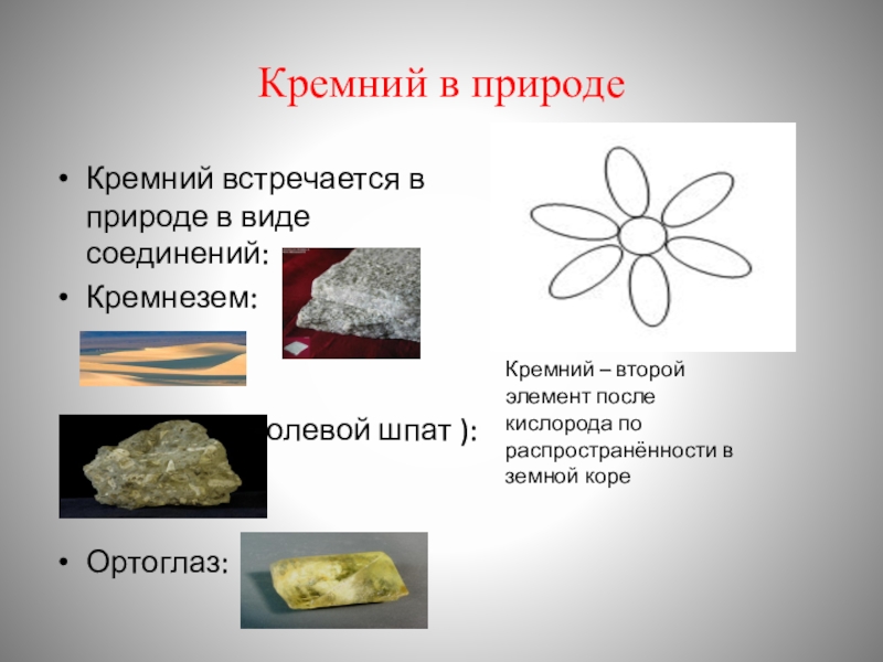 на русском языке означает «утес, скала»; это самый распространенный после кислорода элемент в земной коре (26% по массе); главный элемент в царстве минералов и горных пород; никогда не встречается в чистом виде.