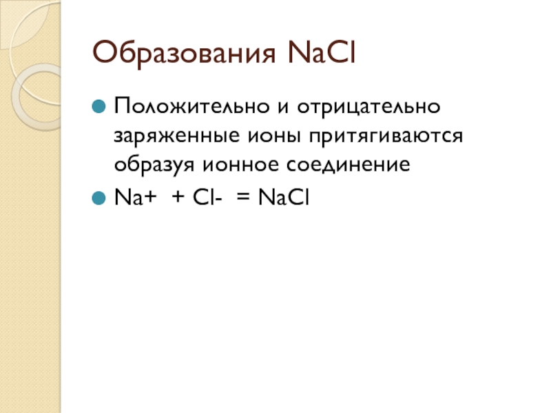 Образования NaClПоложительно и отрицательно заряженные ионы притягиваются образуя ионное соединениеNa+ + Cl- = NaCl