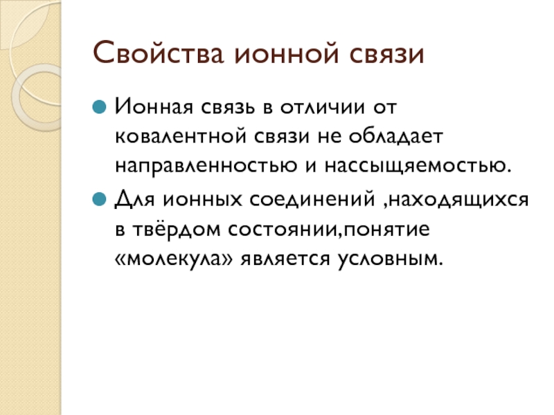 Свойства ионной связиИонная связь в отличии от ковалентной связи не обладает направленностью и нассыщяемостью.Для ионных соединений ,находящихся