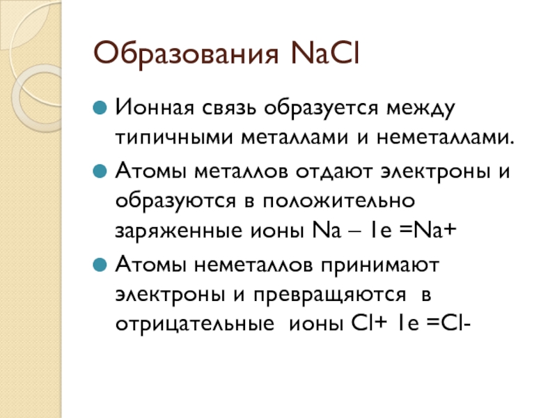 Образования NaClИонная связь образуется между типичными металлами и неметаллами.Атомы металлов отдают электроны и образуются в положительно заряженные